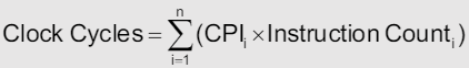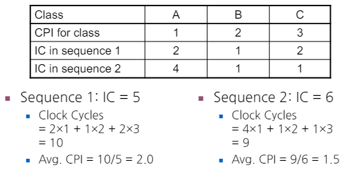• CPI (Cycles Per Instruction)을 좀 더 자세히 설명하자면, 다양한 지시 명령 종류(instruction classes)가 서로 다른 사이클 수를 요구할 때, 이를 종합한 가중 평균 CPI를 계산할 수 있다.