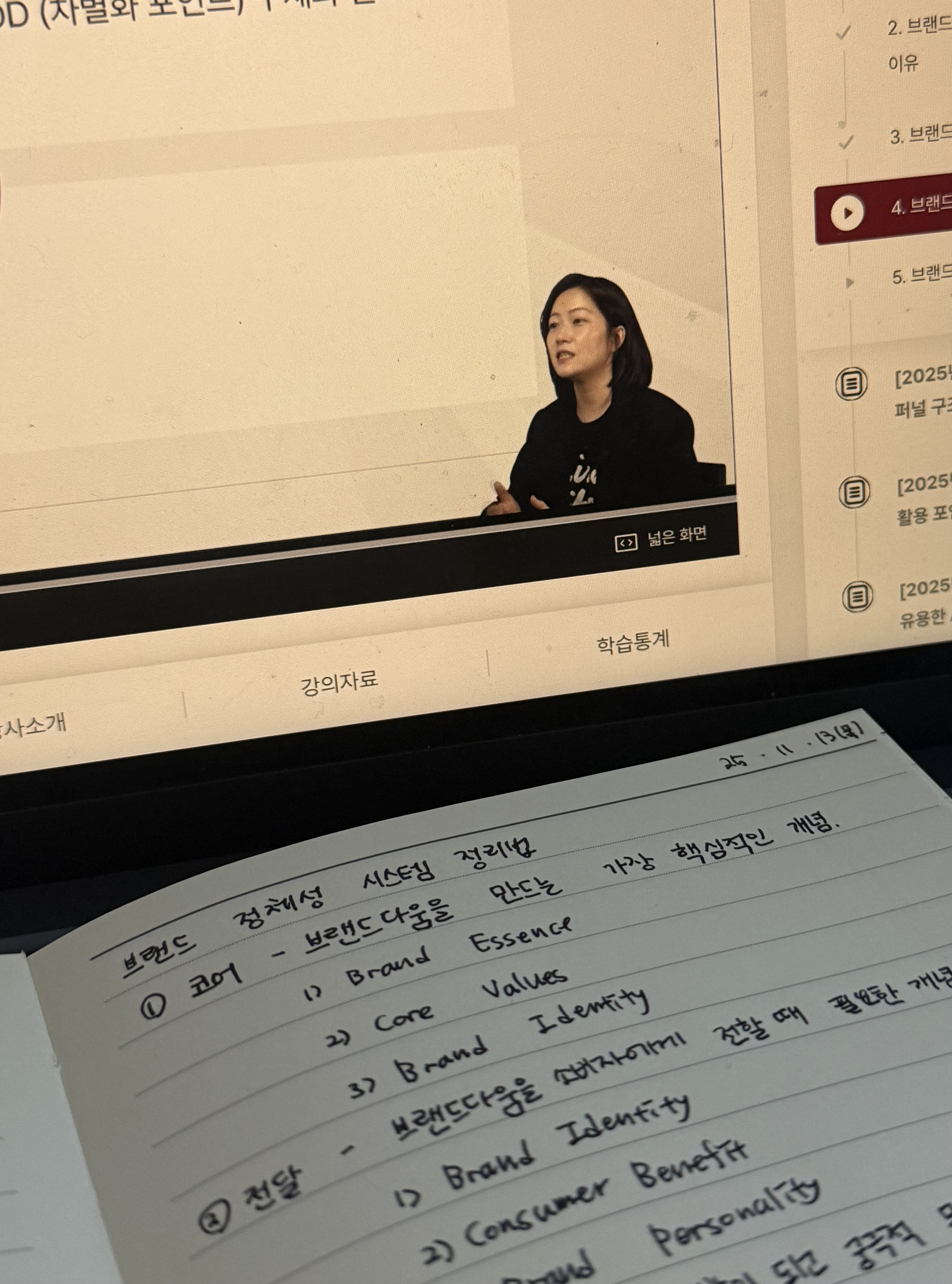 그래도 확실히 느낀 것은, 이렇게 체계적으로 다시 돌아보는 시간이 ‘브랜드의 뼈대’를 다지는 데 큰 도움이 된다는 점이다. 예전에는 영감이 떠오르면 메모하고, 예쁘다고 느끼면 저장하고, 마음에 닿는 문장을 스크랩하는 정도로만 감각적으로 움직였다면, 지금은 그 감각들을 하나씩 해체하고 언어로 정리해 구조화하는 과정이 필요하다는 걸 깨닫고 있다.특히 강의에서 말한 프레임워크에 맞춰 적어보는 과정이 생각보다 큰 인사이트를 준다. 자연스럽게 “내가 만들고 싶은 건 무엇인지”, “왜 이 메시지를 사람들에게 전달하고 싶은지”, “내 진짜 목소리는 어떤 결을 갖고 있는지”를 계속 묻게 된다.