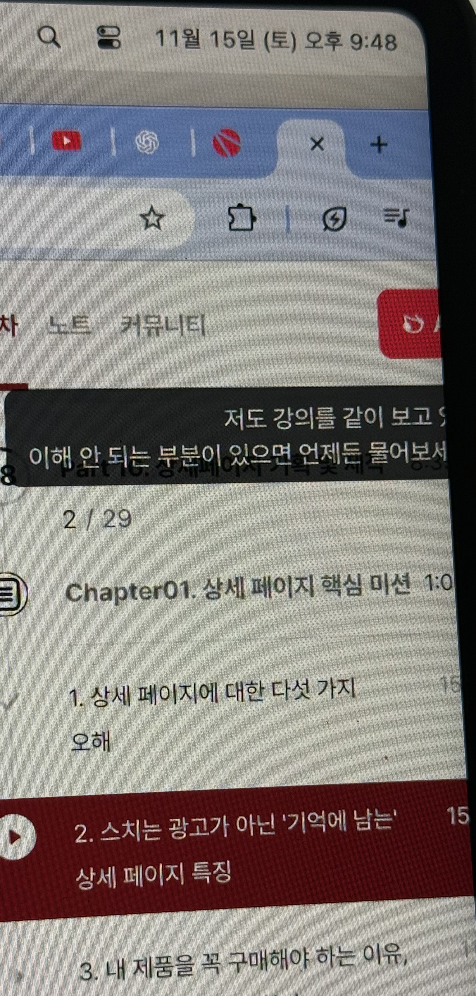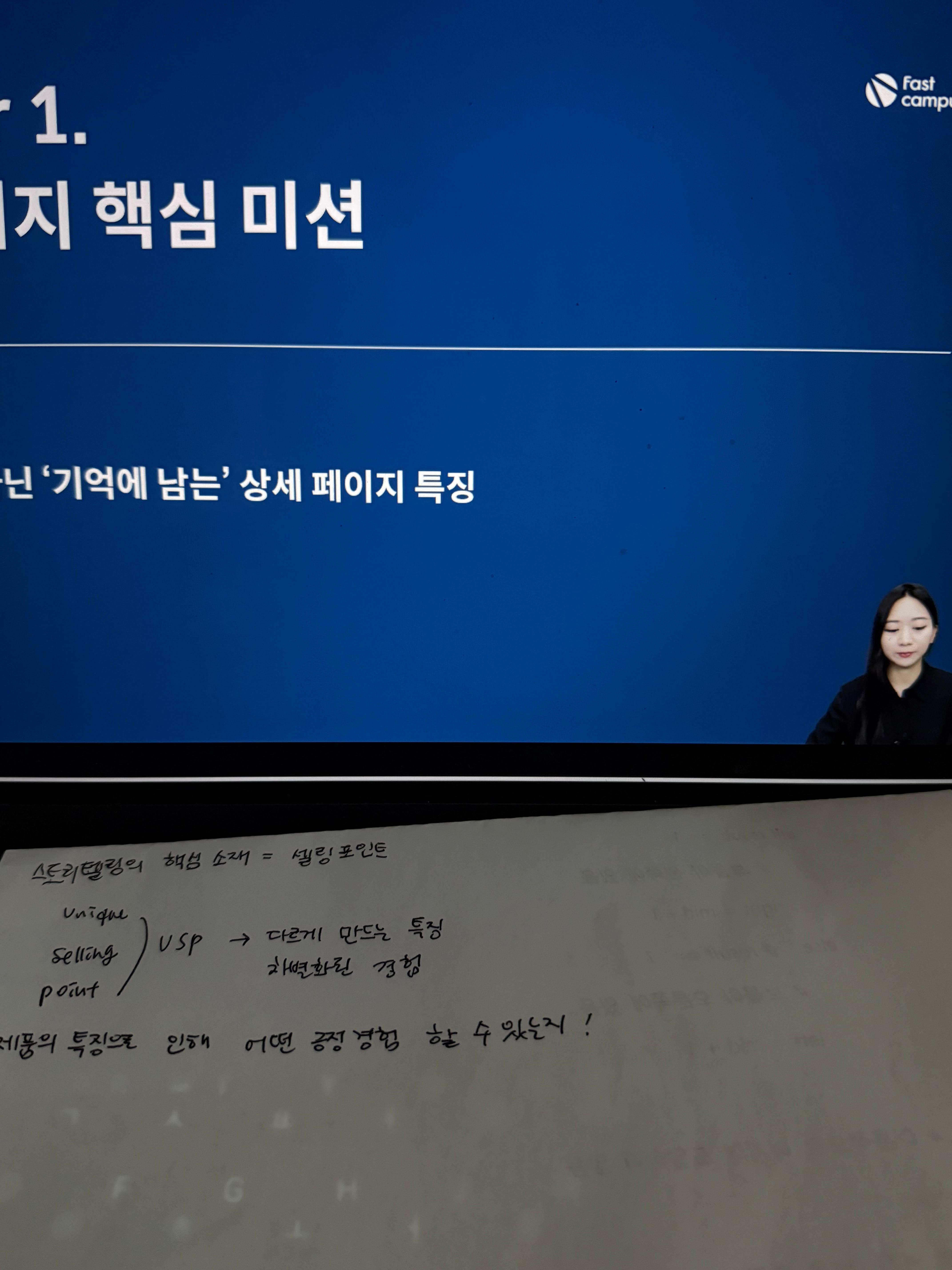 또 흥미로웠던 건, USP가 거창한 무언가가 될 필요는 없다는 사실이었다. 업계 1위를 할 필요도 없고, 누구도 따라 할 수 없는 혁신적인 기술을 만들 필요도 없다. 다만 고객의 특정 문제를 가장 잘 해결하는 방식이 무엇인지 정확히 알고, 그 해결 방식을 명확하게 전달할 수 있으면 그게 곧 USP가 된다는 것이다. 이 부분을 들으면서 나도 자연스럽게 내가 만들 서비스·상품이 어떤 문제를 해결하려는 것인지 더 깊이 생각하게 됐다.예를 들어 고객이 느끼는 불안, 선택의 어려움, 감정적 결정을 돕는 문제 등, 결국 사람들이 무엇 때문에 제품을 찾는지부터 먼저 이해해야 한다는 점이 특히 중요하게 느껴졌다.