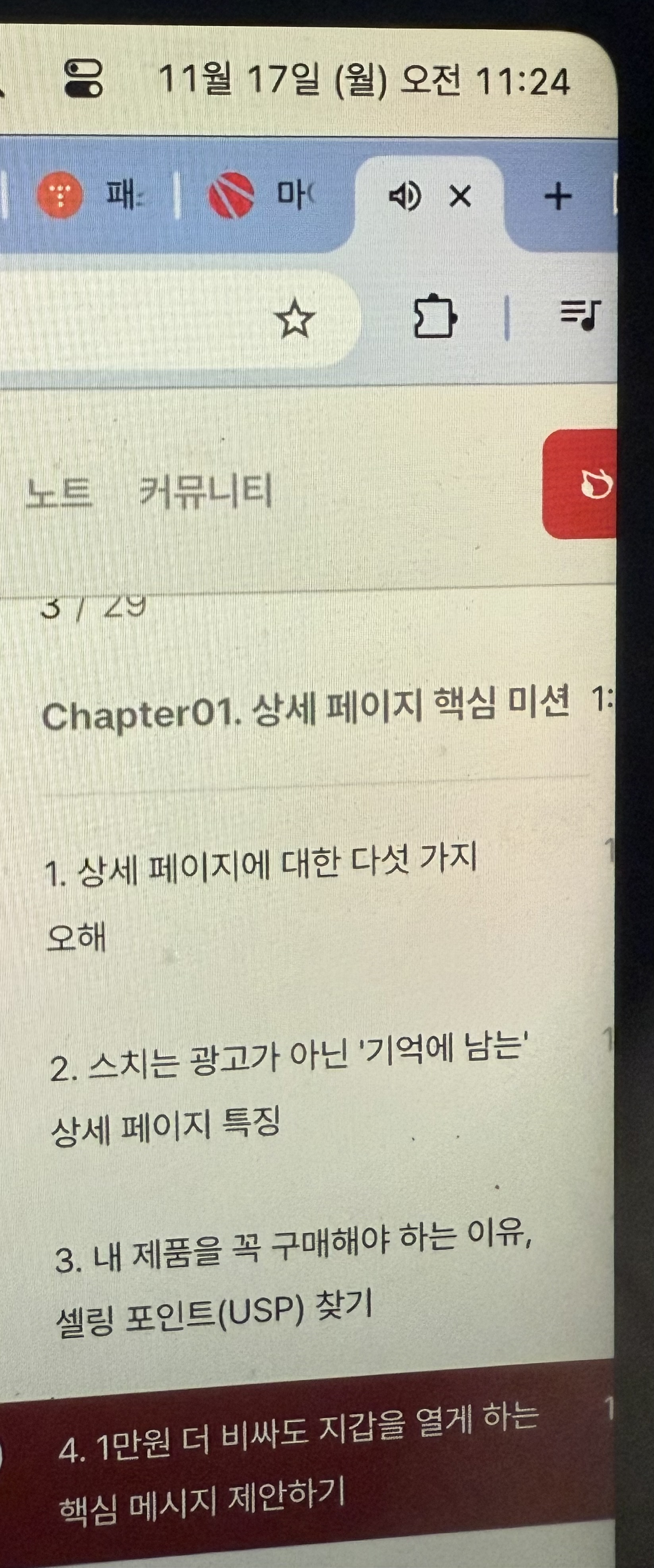 강의를 들으며 가장 크게 느낀 건, 사람들에게 중요한 건 가격 자체가 아니라 “내가 왜 이걸 사야 하는지 스스로 납득할 수 있는 이유”라는 점이다. 예전엔 나도 상세페이지를 만들거나 소개 글을 작성할 때 제품 설명을 더 풍부하게 적는 데만 집중했던 적이 많았다. 기능, 구성, 사용법… 이런 정보들은 분명 필요하지만, 결국 구매를 결정하게 만드는 건 소비자 머릿속에 떠오르는 단 하나의 문장이라는 사실을 새삼 실감했다. 그 한 문장이 명확할수록 소비자는 비교하는 시간을 줄이고, 선택에 대한 확신을 더 빨리 갖게 된다.