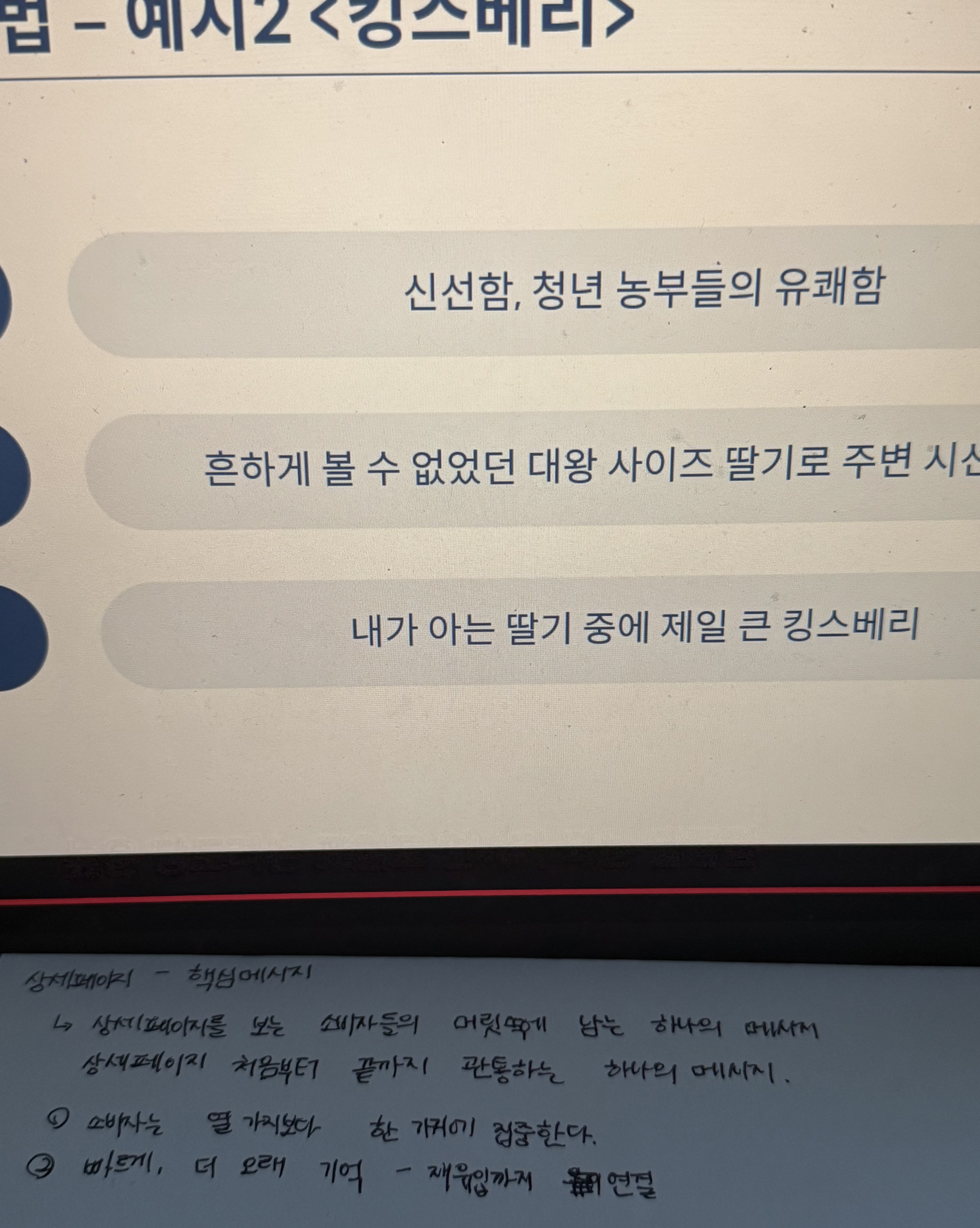 강의에서 강조된 부분 중 특히 와닿았던 건 “핵심 메시지는 감성과 논리를 정확히 섞어야 한다는 것”이다. 감성만 앞서면 공감은 얻지만 신뢰가 떨어지고, 논리만 내세우면 필요한 정보는 전달되지만 기억에 남지 않는다. 결국 소비자가 “이 제품은 나를 이해하고 있다”라고 느끼게 만드는 지점이 메시지의 핵심이라는 걸 배웠다. 단순히 멋있는 문장을 만드는 것이 아니라, 누군가의 마음속에서 막연히 존재하던 불편함이나 욕구를 정확히 언어화하는 과정이 필요했다.