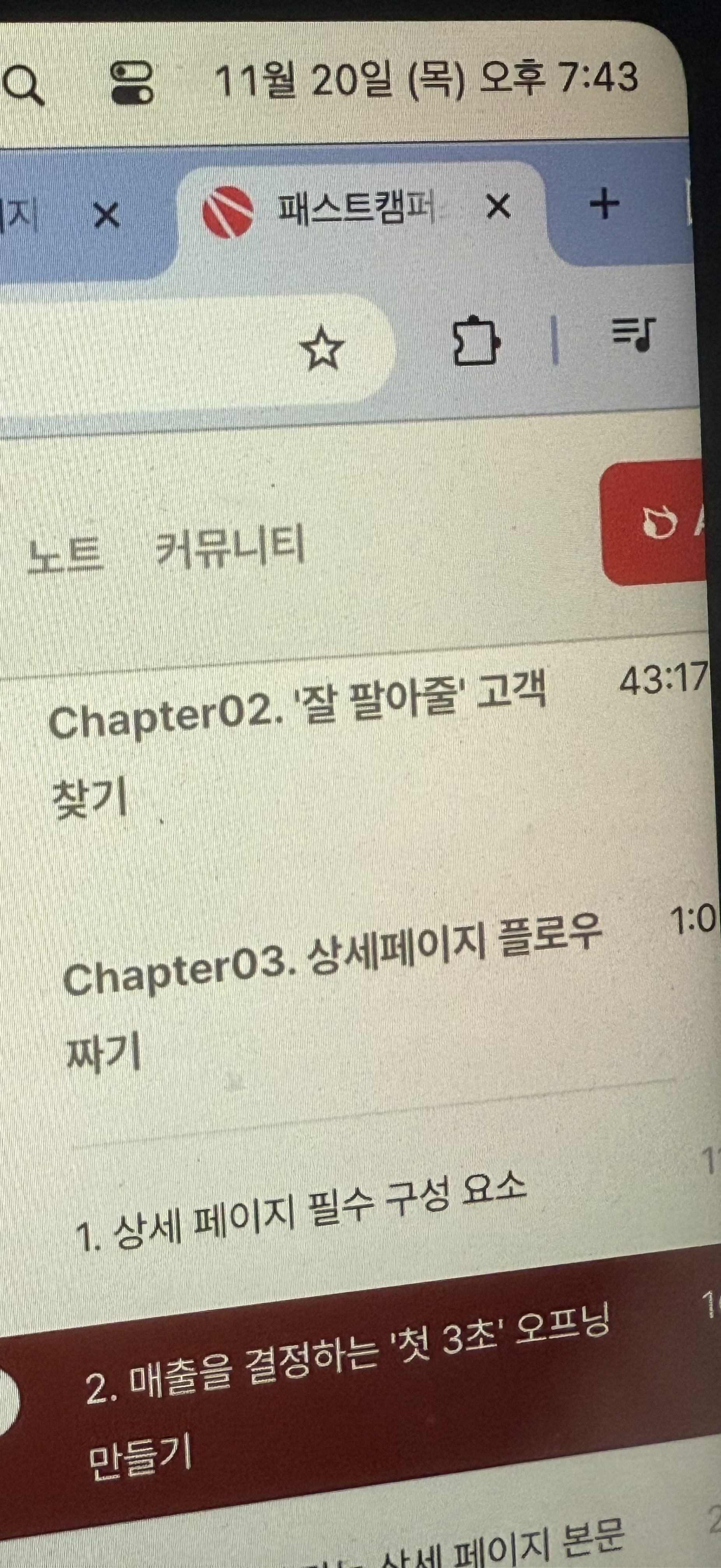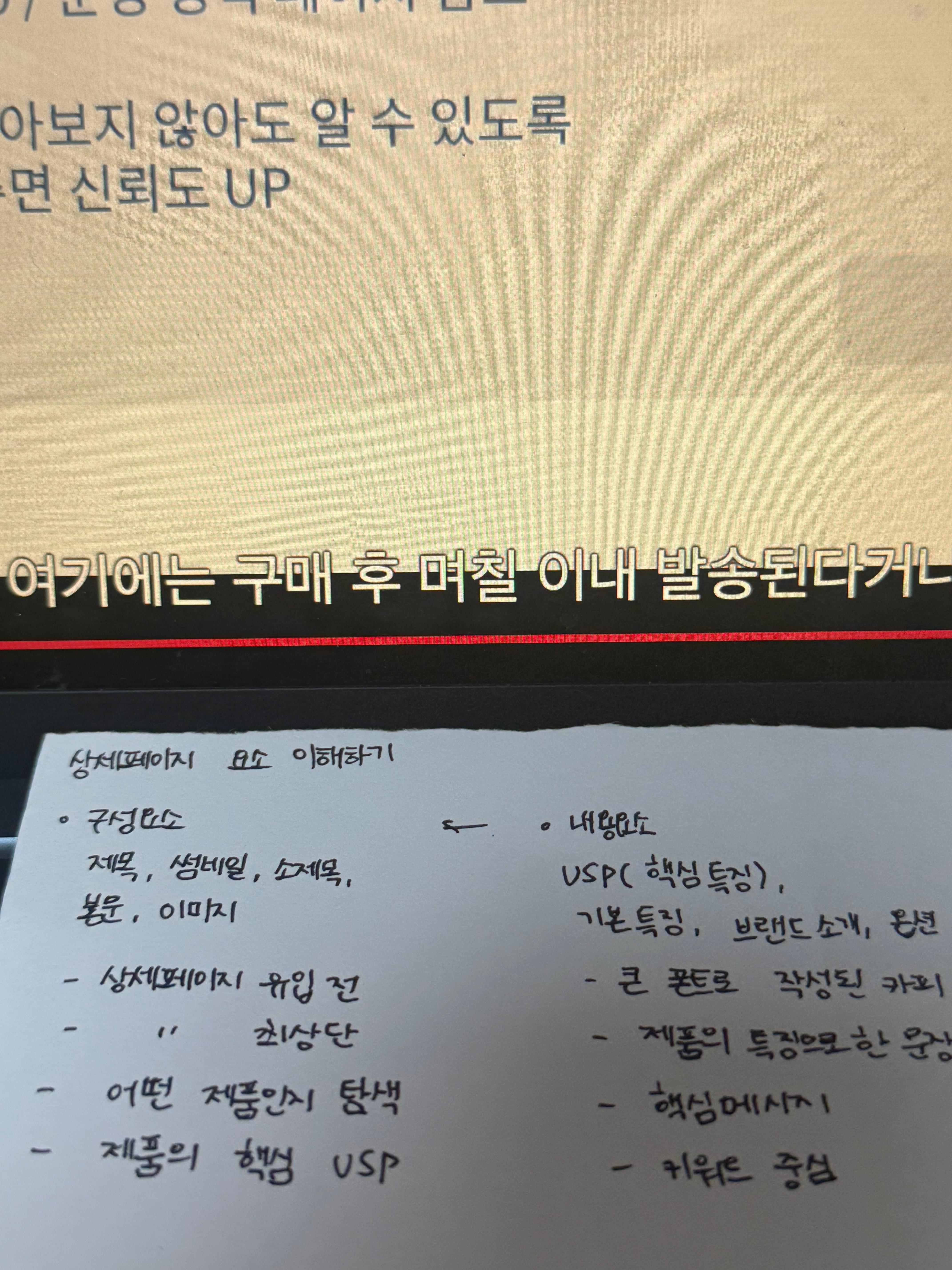 1) 첫 화면은 감성이 아니라 ‘정체성’ 처음 페이지를 열었을 때 보여야 하는 것은 감성이 아니라 제품의 정체성이라는 말을 듣자마자 고개를 끄덕일 수밖에 없었다.고객은 페이지에 들어서는 순간부터 “이게 어떤 제품인지, 나에게 필요한지”를 단번에 판단한다.따라서 첫 화면에서 전달해야 할 핵심은 다음 세 가지라고 한다.제품이 무엇인지어떤 문제를 해결해주는지이 제품이 다른 것보다 나은 이유 그동안 나는 첫 화면에 분위기 사진이나 임팩트 있는 문장을 넣는 데 시간을 많이 들였는데, 정작 고객이 궁금해하는 첫 번째 질문을 정확하게 짚지 못했다는 생각이 들었다.