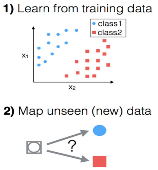 - 요약하자면, 지도 학습에서는 먼저 알려진 레이블이 있는 훈련 데이터를 사용하여 모델을 학습시킨 다음 학습된 모델을 사용하여 새로운 데이터에 대한 레이블을 예측.