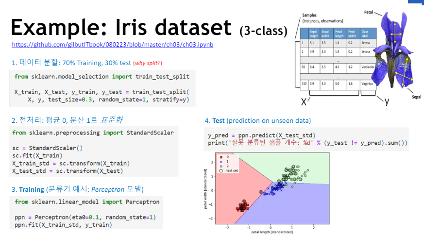 - 아이리스 데이터셋(3개의 클래스를 가진)을 사용한 예시를 통해, 지도 학습 과정을 살펴보자.