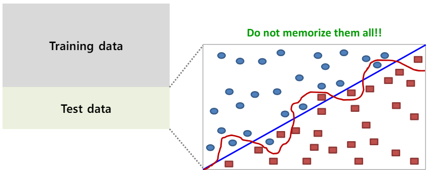 - 이를 방지하기 위해, 별도의 테스트 세트를 사용하여 모델의 일반화 성능을 평가하는 것이 중요.