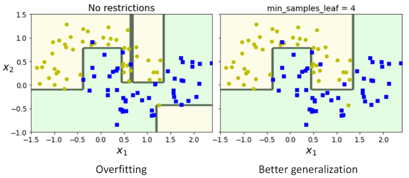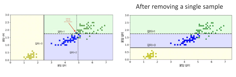 • 결정 트리는 훈련 데이터에 대한 작은 변화에도 예측 결과가 크게 달라질 수 있어, 과적합(overfitting) 문제가 발생하기 쉽다.