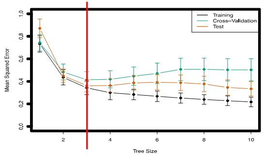 • 여기서 트리 크기가 3일 때 교차 검증(cross validation) 오류가 최소화된다는 것은, 결정 트리의 깊이나 복잡도를 3단계로 설정했을 때 모델이 데이터를 가장 잘 예측하고, 과적합(overfitting)이나 과소적합(underfitting)을 피하면서 가장 낮은 예측 오류를 보인다는 의미입니다.