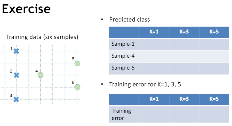 - 주어진 표는 분류 문제의 예시를 나타내며, 훈련 데이터와 테스트 샘플로 구성되어 있다.
