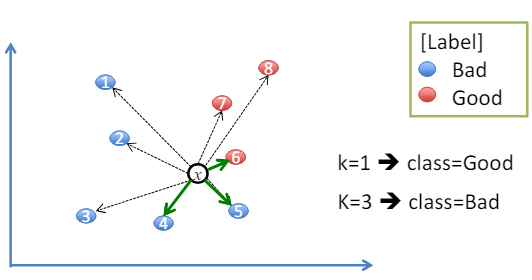 - K-최근접 이웃(K-NN) 알고리즘에서 이웃의 크기, 즉 K의 선택은 매우 중요.