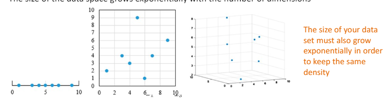 - 차원 수가 증가함에 따라 데이터 공간의 크기가 기하급수적으로 증가하며, 동일한 밀도를 유지하기 위해서는 데이터 세트의 크기도 기하급수적으로 증가해야 함.