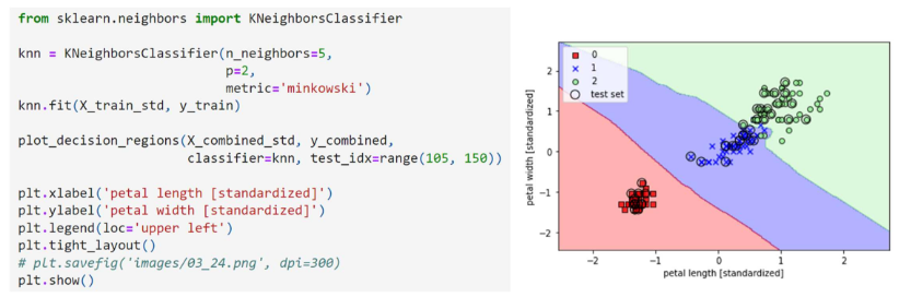 - k-NN에서는 먼저 테스트 샘플과 가장 가까운 k개의 트레이닝 샘플을 찾음.