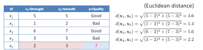 - 이 데이터를 바탕으로, 훈련 데이터를 사용하여 모델을 훈련시키고, 테스트 샘플 x5의 품질이 'good'인지 'bad'인지를 예측하는 것이 목표.