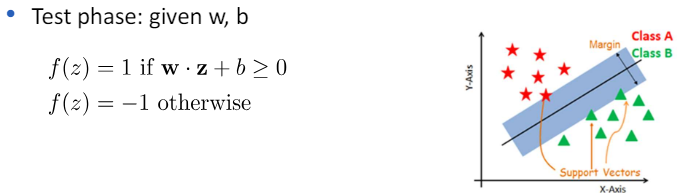 - 테스트 단계 훈련 단계에서 결정된 결정 경계의 파라미터 w와 b를 바탕으로, 새로운 데이터 포인트(테스트 인스턴스)가 주어졌을 때 이를 분류합니다.