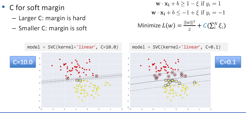 - 선형 SVM에서 데이터가 선형적으로 분리 가능하지 않은 경우, 이 문제를 해결하기 위해 '슬랙 변수(slack variables)'와 'C'라는 조정 파라미터를 도입합니다.