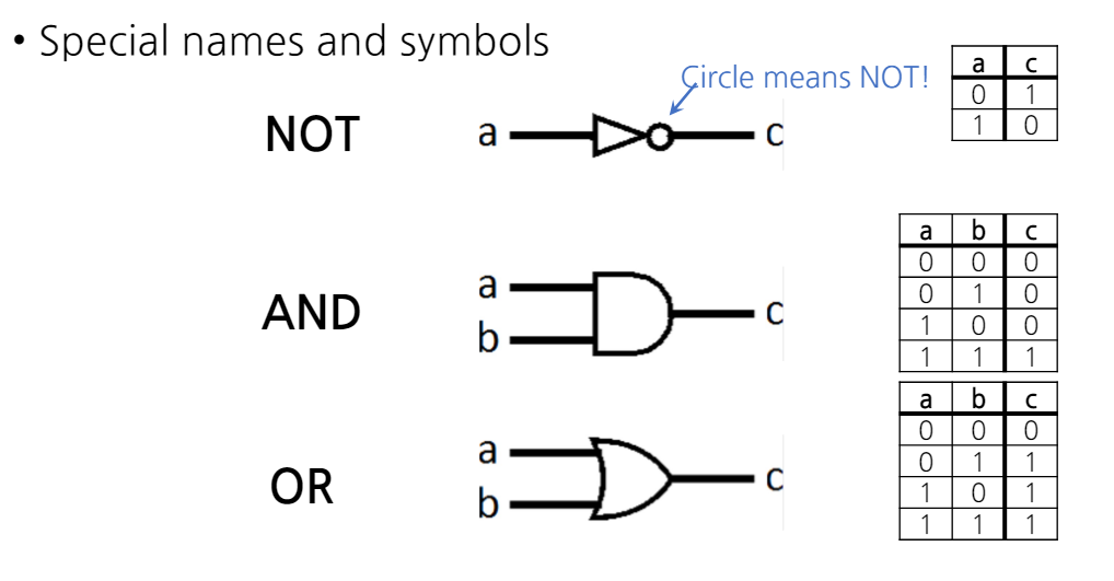 - 고전압/저전압 대신 0과 1의 추상화를 사용하여 입력과 출력을 표현.