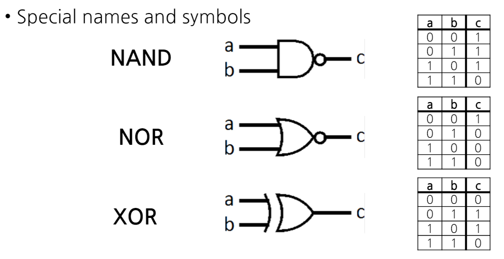 - NAND만으로 AND, OR, NOT을 구축할 수 있다.