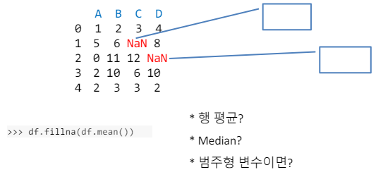 - 예를 들어, 결측값을 단순히 0으로 대체하는 경우 데이터의 분포와 통계적 특성을 왜곡시킬 수 있으므로 주의가 필요.