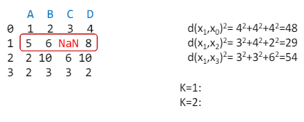 - 선택된 이웃들 중 누락되지 않은 값들을 사용하여 누락된 값을 추정.