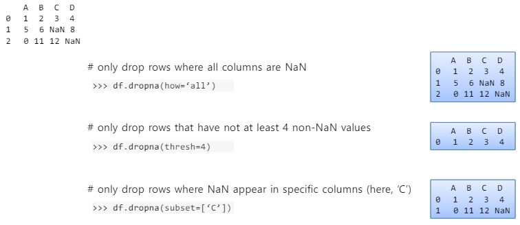 - axis 매개변수를 1로 지정해 NaN이 하나라도 있는 열을 삭제