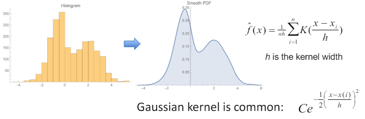 - 커널 밀도 추정은 각 데이터 포인트의 영향을 해당 점 주변의 로컬 이웃에 걸쳐 부드럽게 퍼뜨리는 방식으로 작동함.
