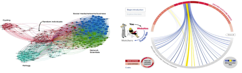 - 예를 들어, 소셜 네트워크에서 사람들 사이의 친구 관계, 학술 연구에서의 인용 네트워크, 인터넷의 웹 페이지들 사이의 링크 구조 등이 네트워크 시각화의 대상이 될 수 있다.