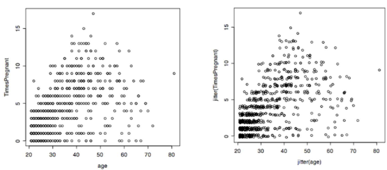 - 이 경우, 많은 사람들이 동일한 나이를 가지고 있기 때문에, 나이에 따른 분포를 점 그래프로 나타내면, 많은 점들이 정확히 같은 위치에 중첩되어 보일 것.
