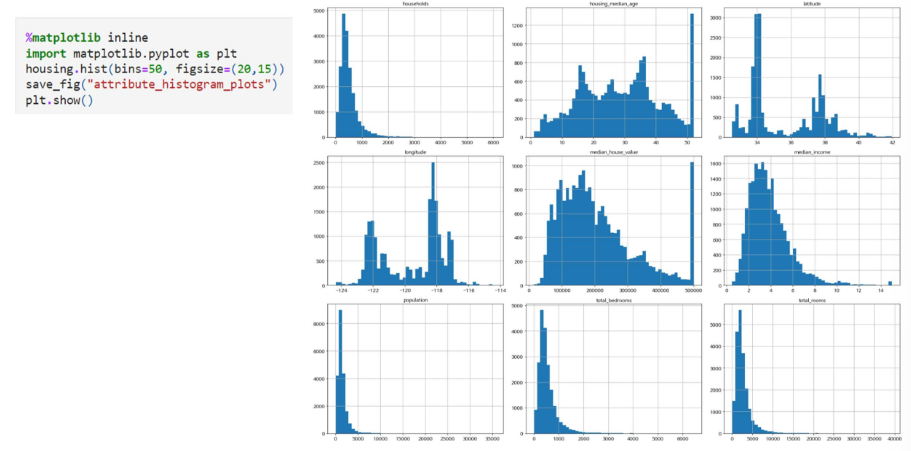 • pandas의 데이터프레임 활용 – head(), info(), describe(), hist() 등을 사용하여 데이터 구조 훑어보기