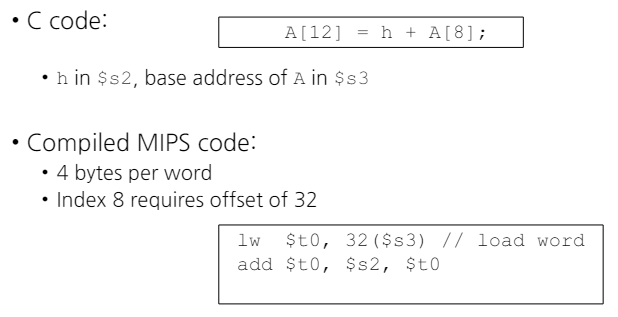 - 어셈블러에서는 임시 값을 위해 $t0, $t1, ..., $t9로, 저장 변수를 위해 $s0, $s1, ..., $s7로 명명.
