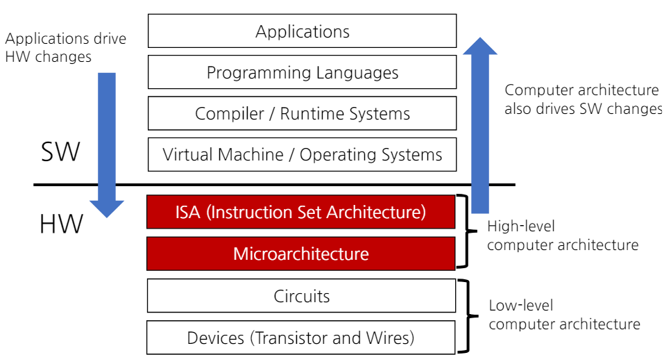- 컴퓨터 아키텍처는 크게 명령어 집합 아키텍처(ISA)와 마이크로아키텍처로 나눌 수 있다.