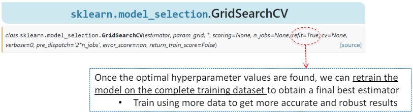 - 최적의 하이퍼파라미터 값을 찾은 후에는, 완전한 훈련 데이터셋을 사용하여 모델을 다시 훈련시켜 최종적으로 최적의 추정기를 얻을 수 있습니다.