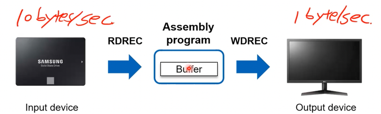 • 사용 가능한 I/O 명령은 RD 및 WD 뿐이므로 각 서브 루틴은 한 번에 한 문자씩 레코드를 전송해야 함